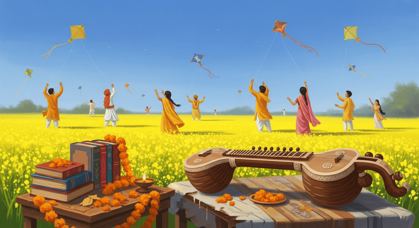 Basant Panchami (also called Vasant Panchami or Saraswati Puja) marks the arrival of spring and is dedicated to Goddess Saraswati — the embodiment of knowledge, music, language and creative arts. The scent of mustard flowers, the sight of yellow saris and turbans, the hush of libraries hosting pujas, and rooftops alive with kites all tell the same story: winter yields to warmth, and we are invited to begin again.
