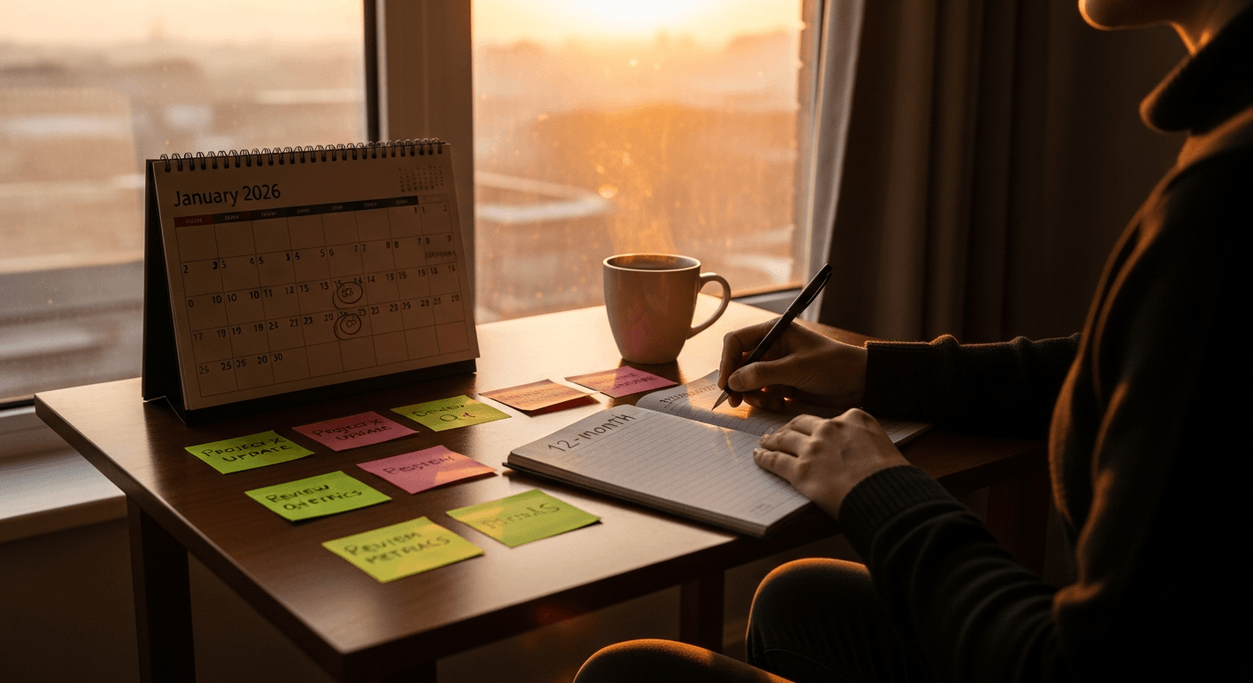 - Spend 4 minutes: list three outcomes you want by July 2026 (one each: health, work, relationship).