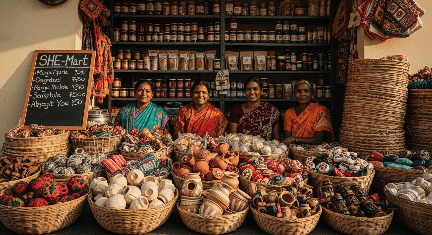 SHE-Marts are framed as the next step after schemes that helped women secure steady livelihoods. Where earlier interventions focused on skills and credit, SHE-Marts aim to create the infrastructure to convert those skills into visible enterprises — a shelf in a store, a price tag, repeat customers.