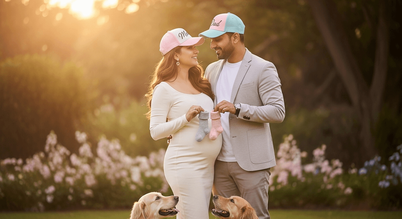 In the pictures they wear playful baseball caps reading “Mom” and “Dad,” hold tiny woollen socks, and share hugs that feel like a promise. Their pet dogs even make a cameo; honestly, it makes the announcement feel like a warm family postcard rather than a headline.